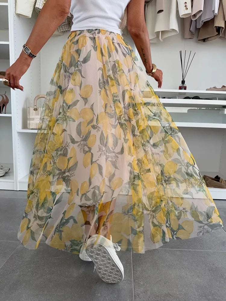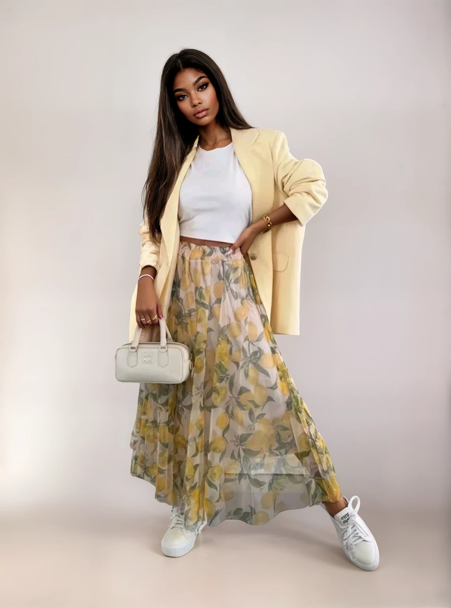 Der Rock begeistert mit einem luftigen Schnitt und einem zarten, floralen Muster in Gelb- und Grautönen. Durch den transparenten Überstoff und das leichte Innenfutter trägt er sich besonders angenehm an warmen Tagen. Der elastische Bund sorgt für eine perfekte Passform und hohen Tragekomfort. Ideal für einen romantischen Sommerlook oder elegante Freizeit-Outfits.