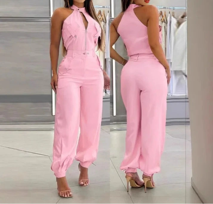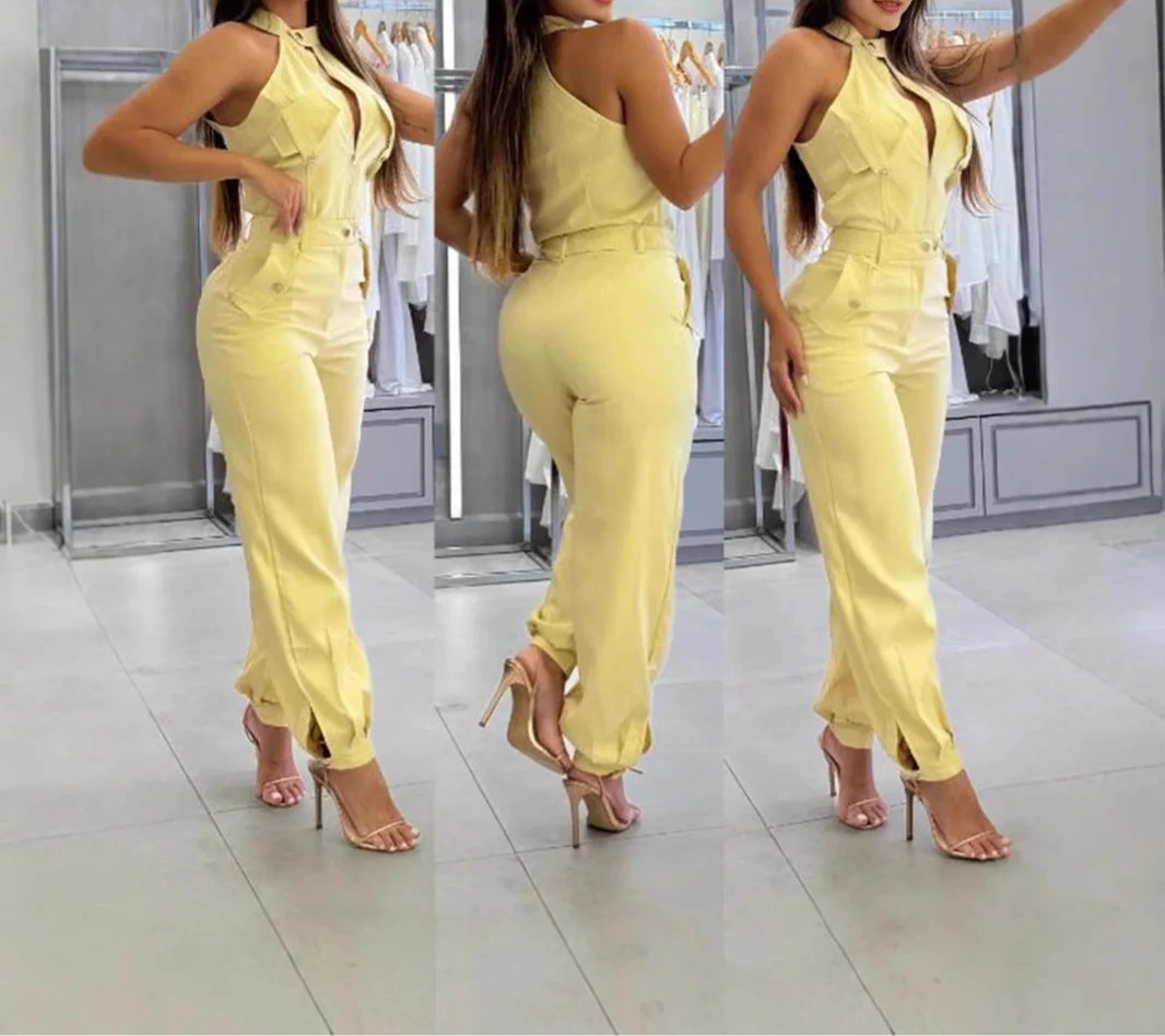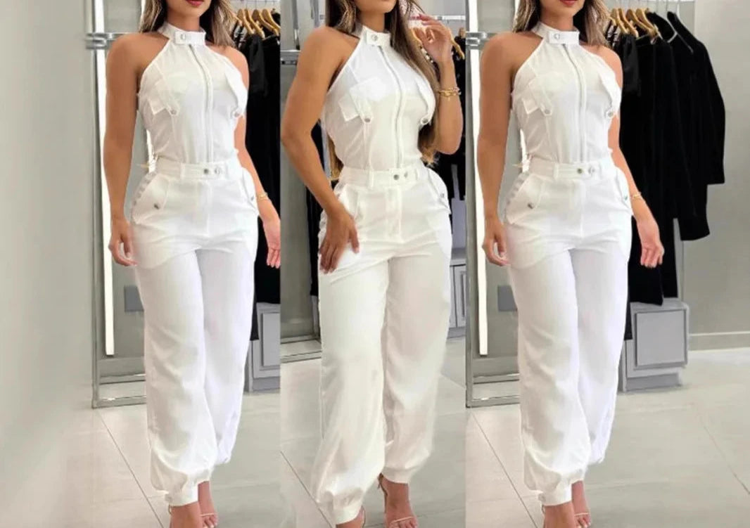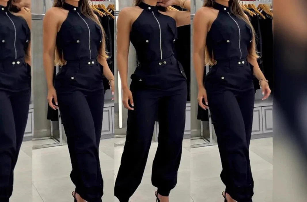 Dieser stylische Jumpsuit kombiniert modernes Design mit femininen Details. Mit seinem raffinierten Halterneck-Schnitt, den aufgesetzten Taschen und der taillierten Silhouette sorgt er für einen modischen Auftritt – perfekt für Events, Brunch-Dates oder Fashion-Partys.