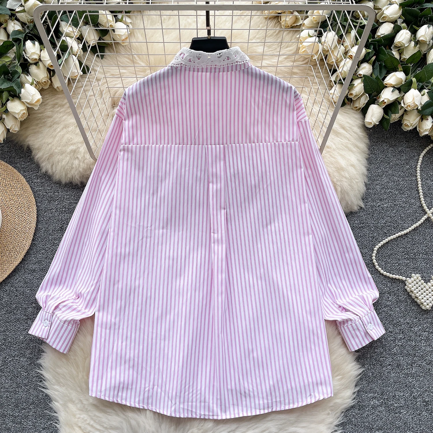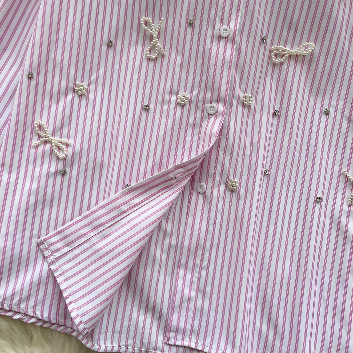 Unser hochwertiges Hemd mit feinen rosa/Blau Streifen, Perlen- und Schleifendetails sowie verziertem Kragen vereint feminine Eleganz mit modernem Chic. Perfekt für besondere Anlässe oder um deinem Alltagslook einen edlen Touch zu verleihen.
