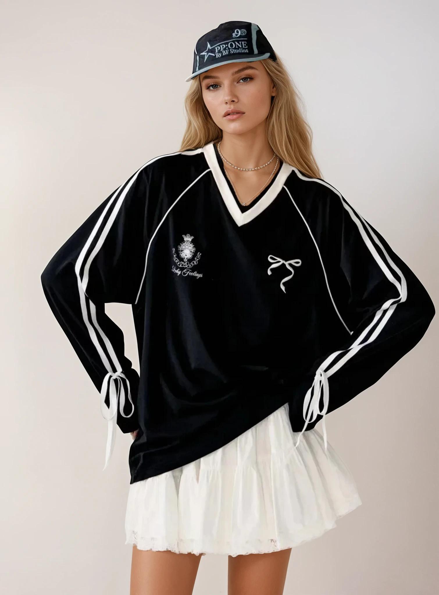 Dieses Oversize-Jersey begeistert mit einer perfekten Mischung aus sportlicher Coolness und femininer Raffinesse. Der V-Ausschnitt und die kontrastierenden Streifen-Designs sorgen für einen angesagten Look, während die weite Passform für ein angenehmes Tragegefühl sorgt.