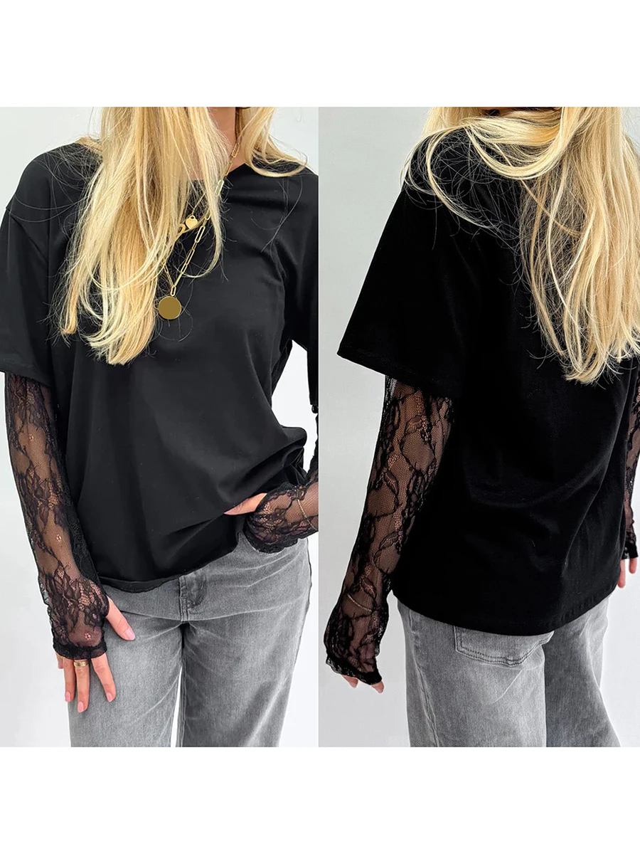 Stylisches T-Shirt mit einzigartigen Spitzenärmeln. Der Mix aus lässigem Schnitt und eleganten Details macht dieses Oberteil zu einem besonderen Highlight für Alltag und Abend.