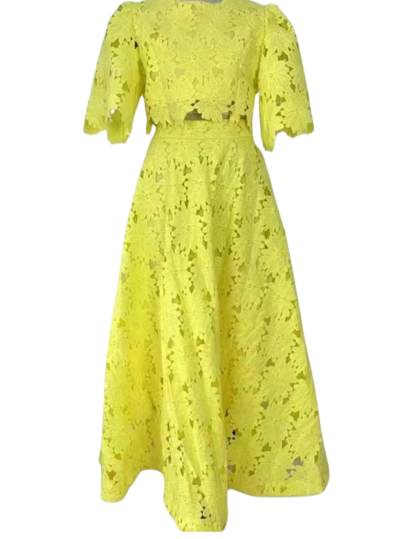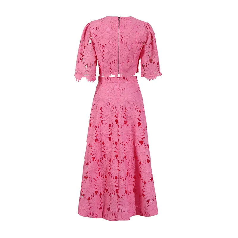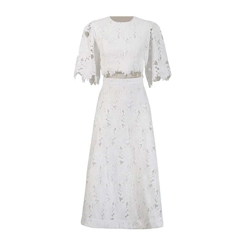 Verleihe deinem Look romantische Leichtigkeit mit diesem zweiteiligen Ensemble aus floraler Spitze. Das Set aus kurzem Oberteil mit Puffärmeln und fließendem Midirock besticht durch filigrane Ausstanzungen und ist ideal für Sommerfeste, besondere Anlässe oder elegante Tages-Events.